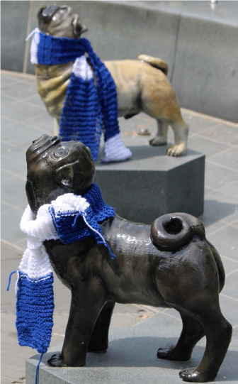 On Wednesday the 2nd of June, there was still no water flowing in the Dog Fountain, even though the day was warm. And again the fountain dogs were wearing scarves. This time their scarves were blue and white.
