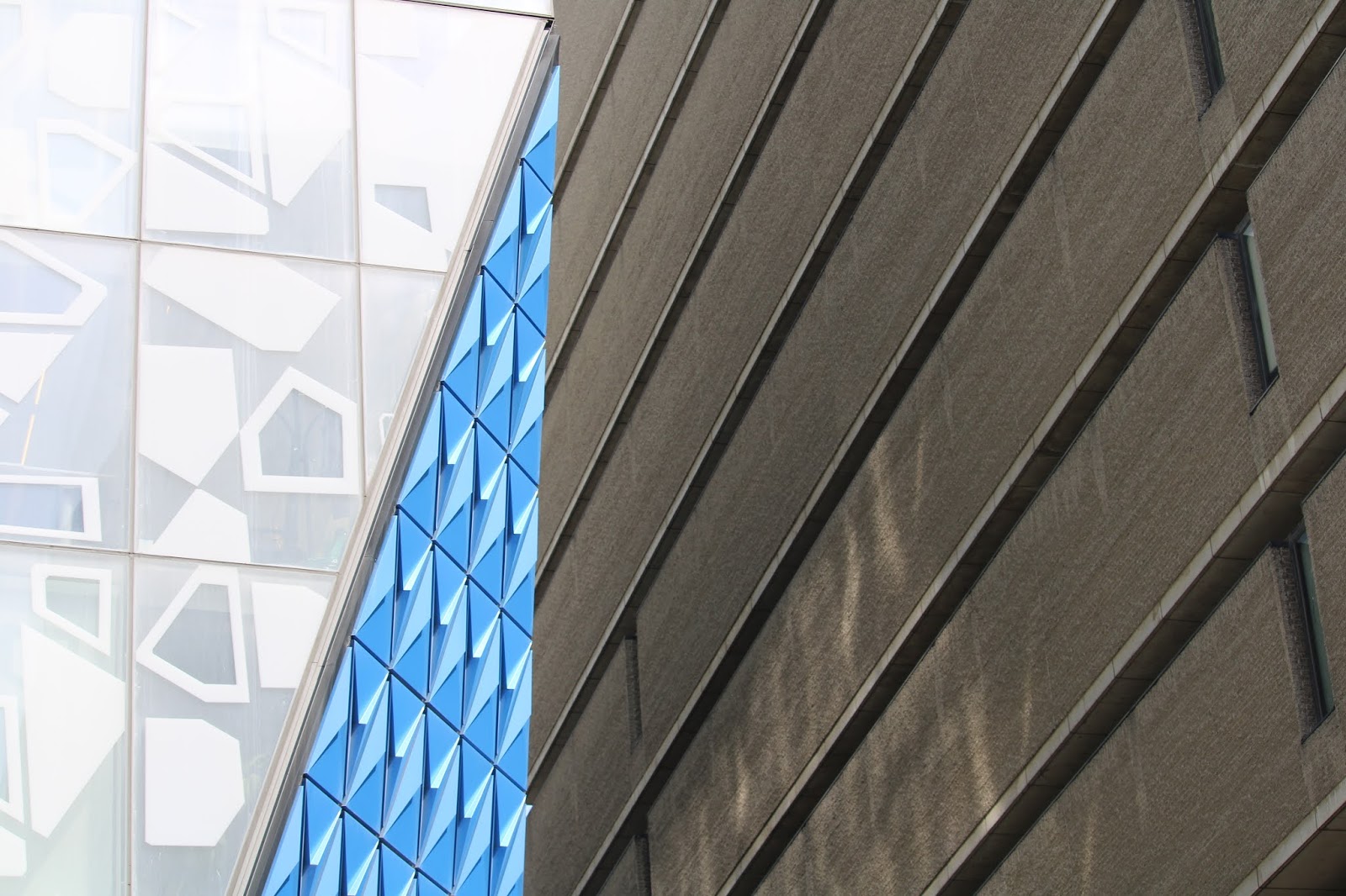 My first guess was that the scarves were Ryerson University scarves. If you asked me normally what are Ryerson colors I would say "no idea." But I had just walked through Ryerson university's main city campus and there was a lot of blue and white around. Here's a section of the new Ryerson university building, which features blue and white: